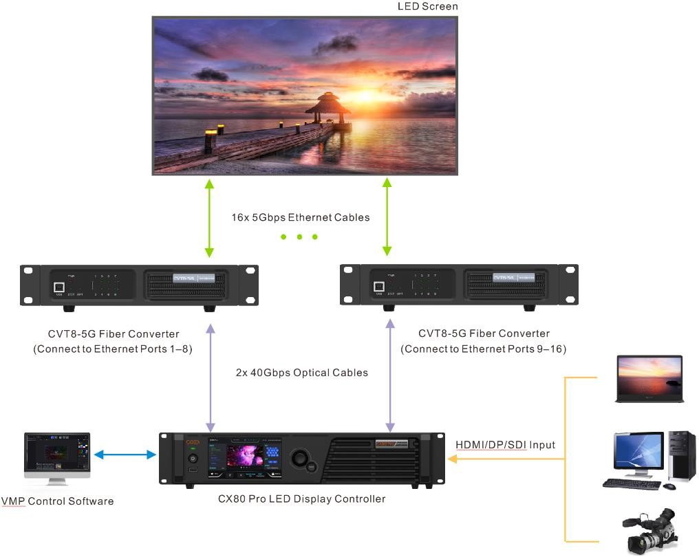Novastar CX40 Pro hỗ trợ nhiều giao diện đầu vào video (HDMI 2.0, DP 1.2, 12G-SDI), hỗ trợ đầu ra cổng mạng 5Gbps và đầu ra cổng quang 40Gbps hỗ trợ t