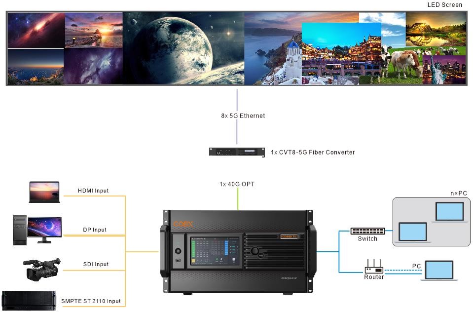 Novastar CX40 Pro hỗ trợ nhiều giao diện đầu vào video (HDMI 2.0, DP 1.2, 12G-SDI), hỗ trợ đầu ra cổng mạng 5Gbps và đầu ra cổng quang 40Gbps hỗ trợ t
